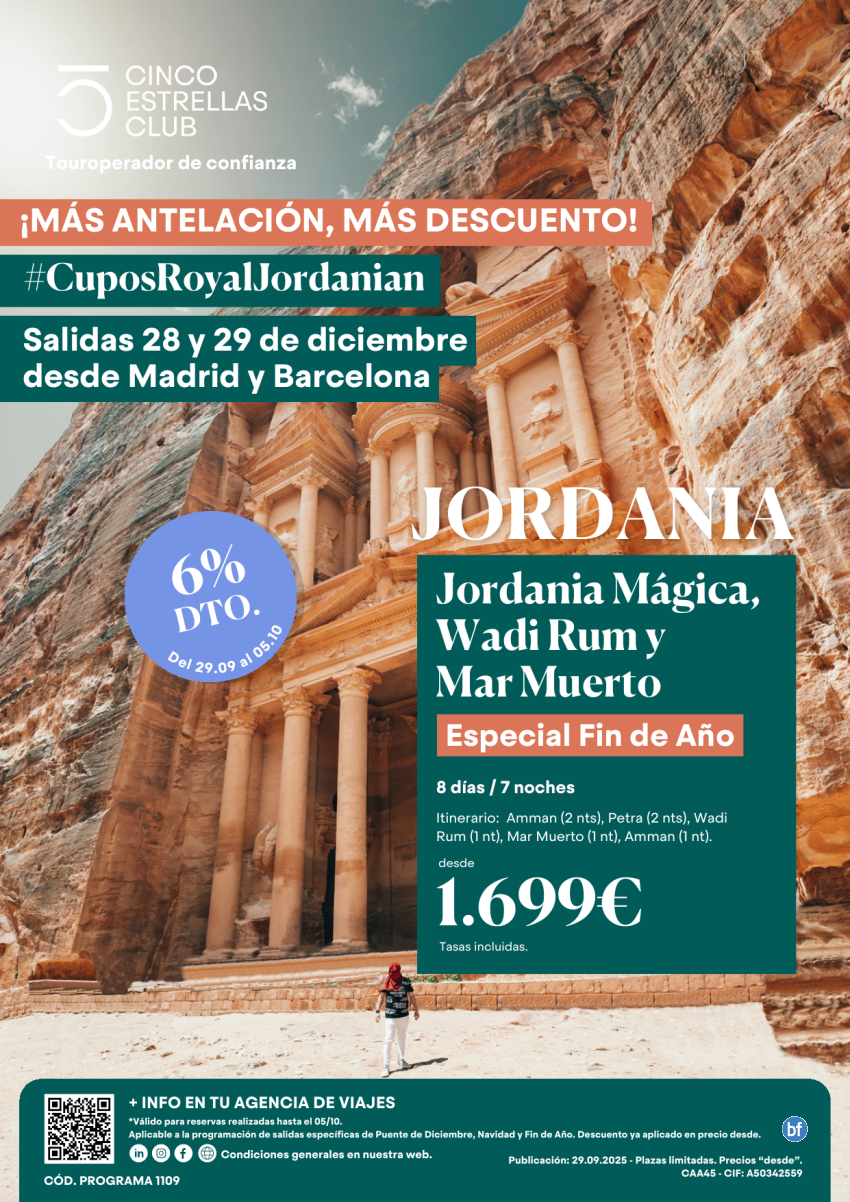 6% hsta 05.10Cupos R.J.|Jordania Mágic.,Wadi Rum/Mar Muerto dsd 1.699€ Fin Año 8ds/7ns sal.28y29 dsd Mad y Bcn