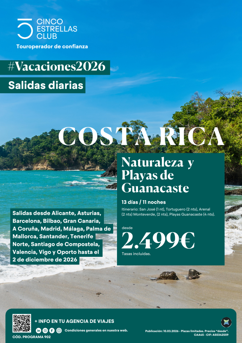 Naturaleza y Playas Guanacaste 13ds/11ns dsd 2.499€ sal. diarias hsta diciembre'26 ver aerop. salidas en ofert
